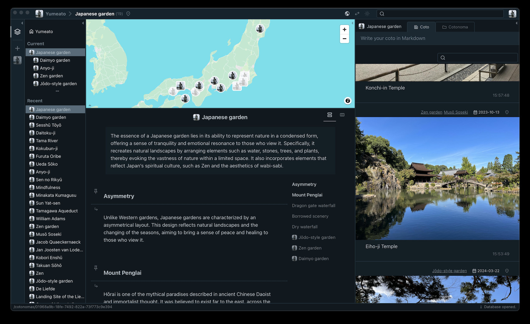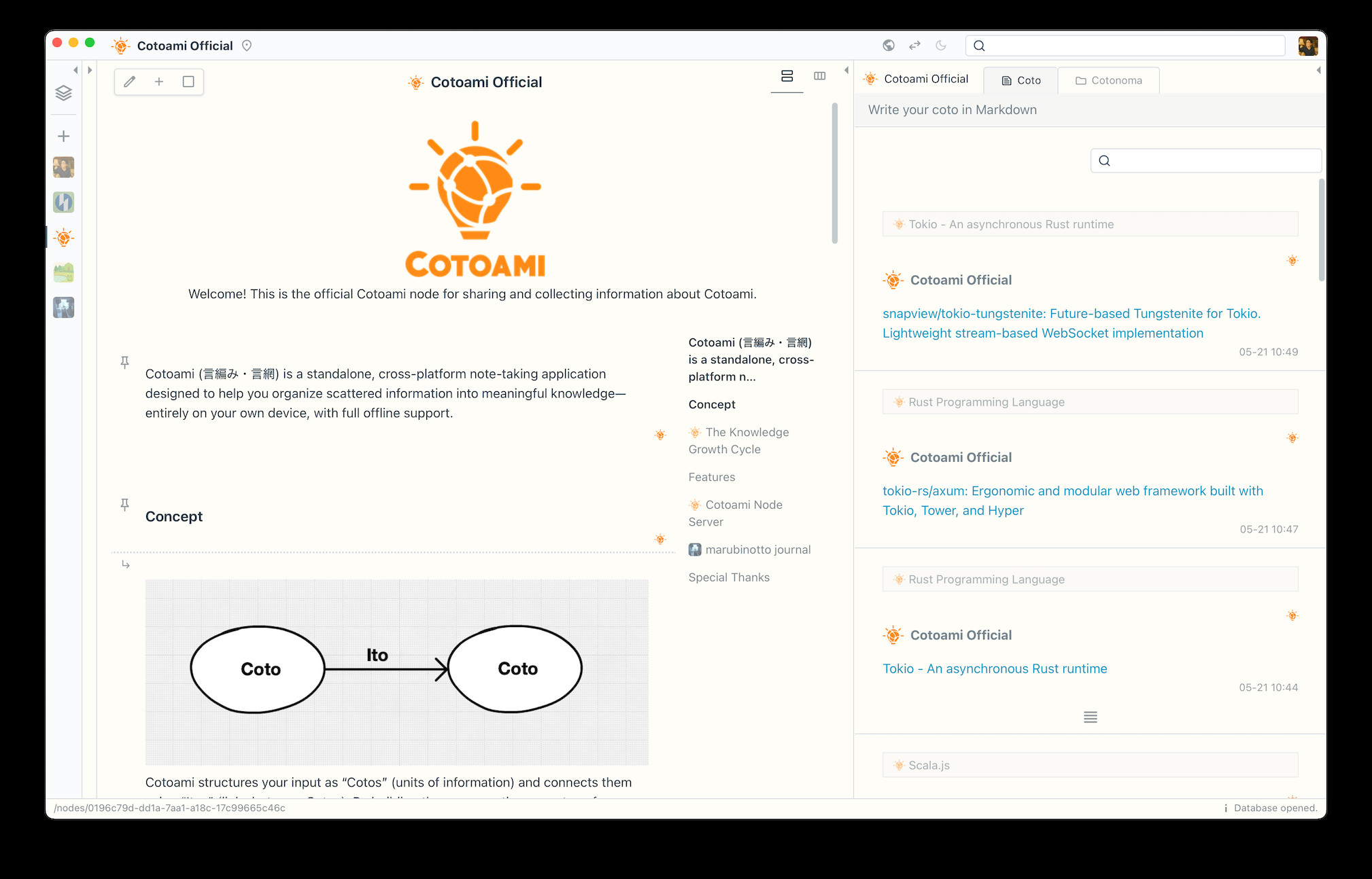 Cotoami je aplikace sloužící pro snadnou tvorbu a správu znalostních grafů, díky nimž lze přehledně propojit jednotlivé myšlenky a informace do smysluplných struktur. Všechny poznámky a myšlenky lze také vizualizovat a a vzájemně propojovat. Program podporuje i týmovou spolupráci více uživatelů v reálném čase prostřednictvím síťových databází.