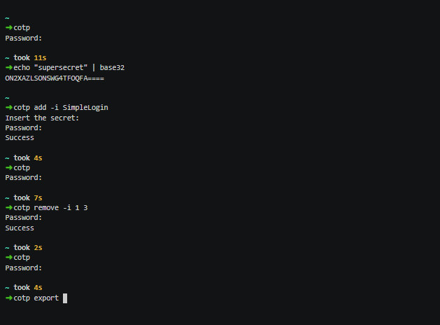 cotp je nástroj ovládaný pomocí příkazového řádku, který slouží jako důvěryhodný a šifrovaný TOTP/HOTP autentizátor s funkcemi pro import. Program dokáže spravovat autentizační kódy určené pro dvoufázové ověřování (2FA).