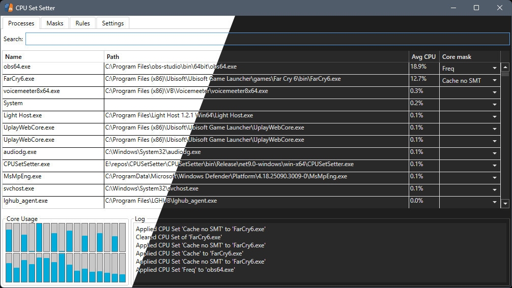 CPU Set Setter je aplikace sloužící pro optimalizaci a zvýšení výkonu CPU pomocí rozdělení jader. Uživatel může přesně definovar, na jakých procesorových jádrech běží jednotlivé aplikace nebo PC hry, což může výrazně zlepšit výkon u procesorů AMD 3D V-Cache s dvojicí CCD čipletů (např. Ryzen 9950X3D, 9900X3D, 7950X3D nebo 7900X3D).