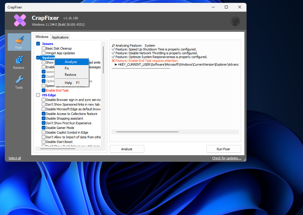 Crapfixer provede nejprve analýzu systému a detekuje běžné prvky, které mohou být pro uživatele nežádoucí. Jedná se zejména o předinstalované UWP aplikace (Xbox, Zune Music, 3D Viewer), pozůstatky po Cortaně, OneDrive integraci nebo reklamní obsah ve Start Menu a zamykací obrazovce.