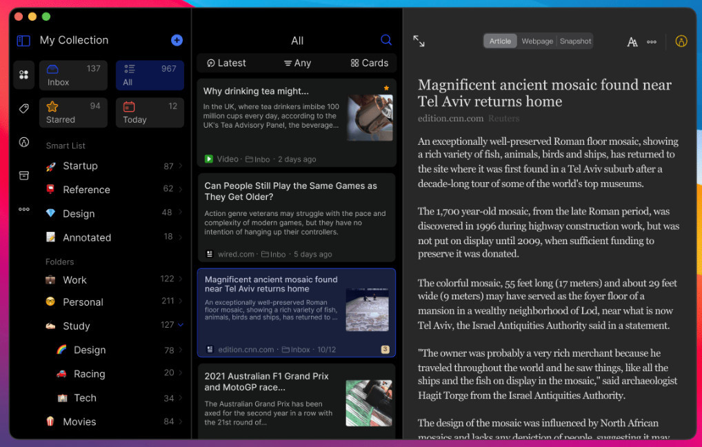 Informace, ale i jejich zdroje je možné třídit do složek a podsložek. Materiály je možné pak pročítat pomocí jednoduchého a přehledného prohlížeče.
