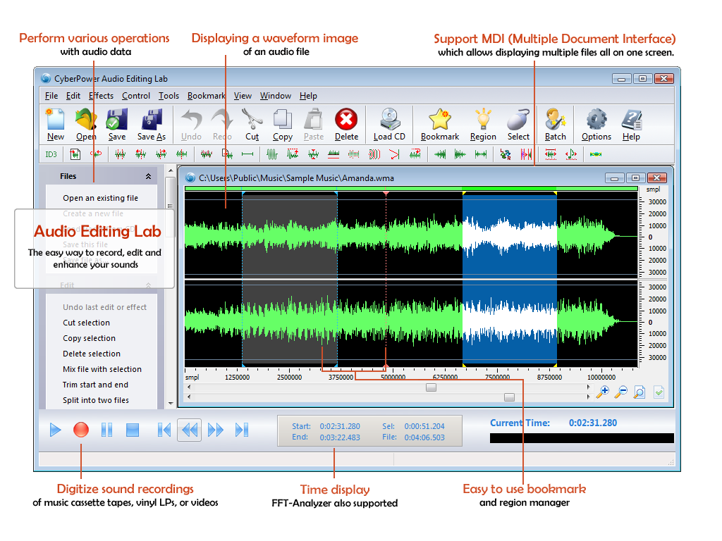 CyberPower Audio Editing Lab je přehledný audio editor pro záznam a další zpracování hudby. Program je vhodný, díky svému ovládání, pro začínající i pokročilé uživatele.
