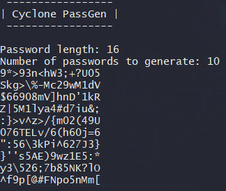 Cyclone's PassGen je nástroj ovládaný pomocí příkazového řádku (CLI), který slouží pro generování silných hesel. Uživatel pouze definuje požadovanou délku a počet generovaných hesel. Takto náhodně generovaná hesla obsahují velká písmena i malá písmena, čísla a samozřejmě speciální znaky.