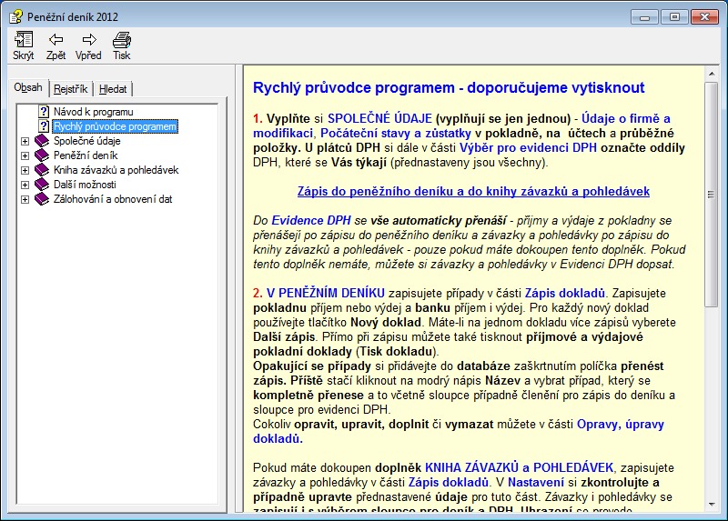 Kdykoliv můžete cokoliv opravit a vše se automaticky přepočítá. Zapisovat do deníku se dá průběžně nebo ho lze sestavit i za delší období. Tisk deníku je přehledný a srozumitelný pro uživatele i úřady. Aplikace je určena pro laiky i účetní firmy.