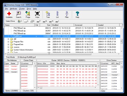 Directory Snoop je nástroj pro vyhledávání, úpravu nebo obnovení smazaných souborů až na úrovni jednotlivých clusterů. Podporovány jsou všechny souborové systémy FAT a NTFS a kromě pevných disků i přenosné USB klíčenky, diskety nebo ZIP disky.