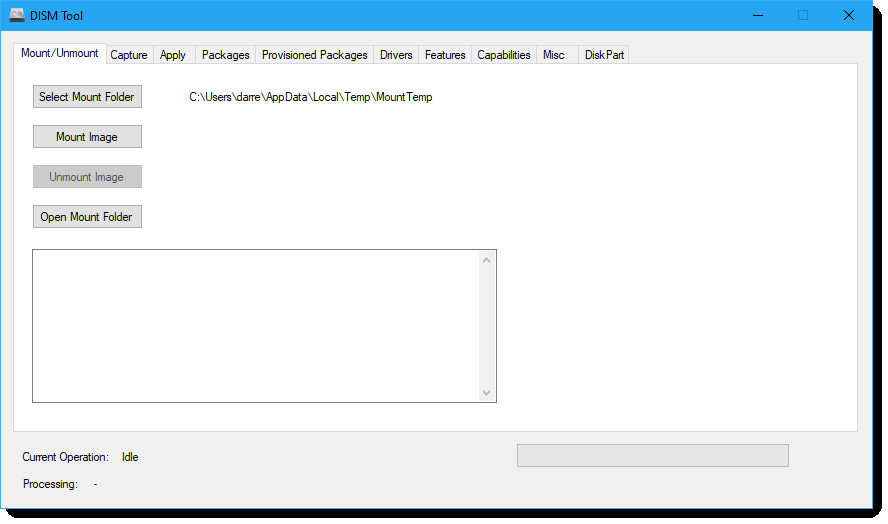 Program umožňuje například zachytit obraz, aplikovat obrazy, exportovat a vypsat balíčky, ovladače a funkce, přidat nebo odebrat ovladače, připojit či odpojit obrazy, zkontrolovat a opravit obrazy a mnoho dalšího.