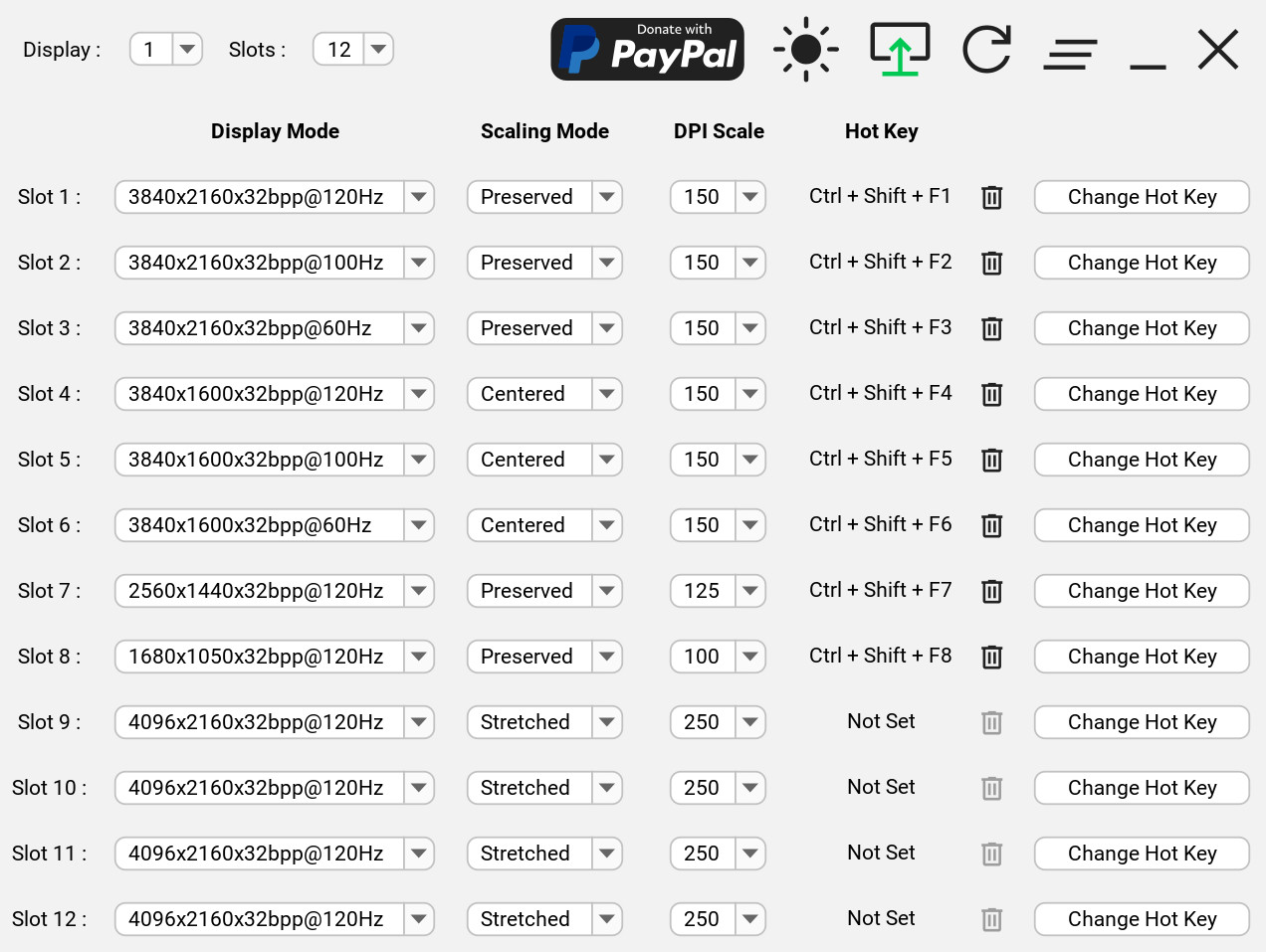 Display Hot Keys je nástroj sloužící pro rychlou a snadnou změnu rozlišení obrazovky respektive displeje pomocí příslušné klávesové zkratky. Změnit lze nejen rozlišení, ale také hloubku barev, obnovovací frekvenci, režim škálování nebo procento škálování DPI. Uživatel si může definovat více profilů a ke každému nastavit vlastní klávesovou zkratku.