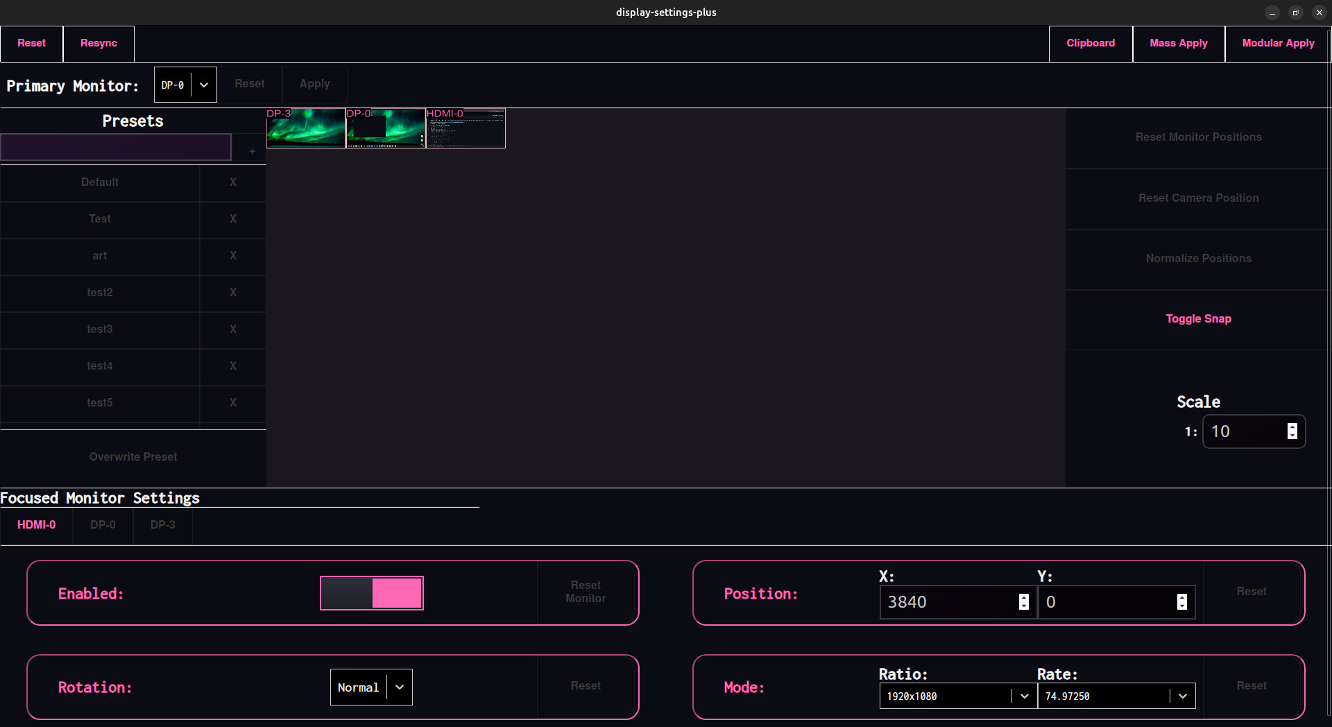 Display Settings Plus for Linux je aplikace sloužící jako grafické rozhraní (GUI) pro nástroj Xrandrm jehož pomocí lze snadno a rychle změnit nastavení displeje. Uživatel může snadné změnit rozlišení, natočení, umístění a aplikaci profilů apod. Podporována je i práce s více připojenými monitory.