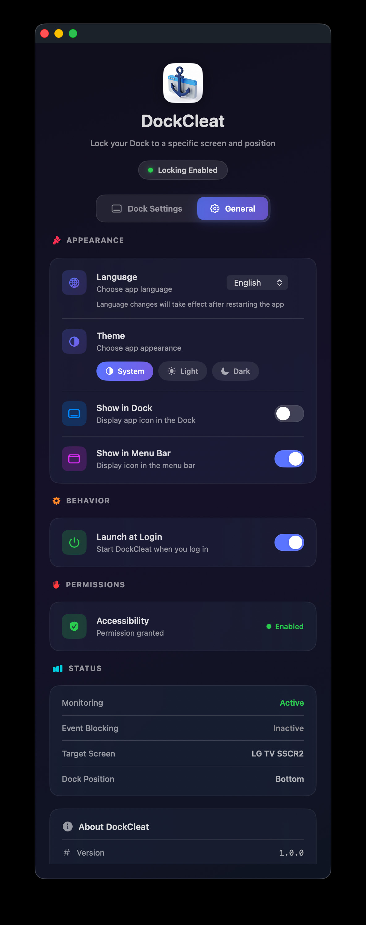 DockCleat for Mac je nástroj, který dokáže uzamknout Dock s ikonami v macOS na hlavní obrazovce. Dock se totiž může někdy objevit na sekundárních obrazovkách nebo se při používání více obrazovek neočekávaně přesunout. Nástroj je spuštěn na pozadí systému a automaticky hlídá a vynucuje zvolenou konfiguraci. Uživatel si sám vybere konkrétní monitor a umístění Docku, tj. dole, vlevo nebo vpravo.