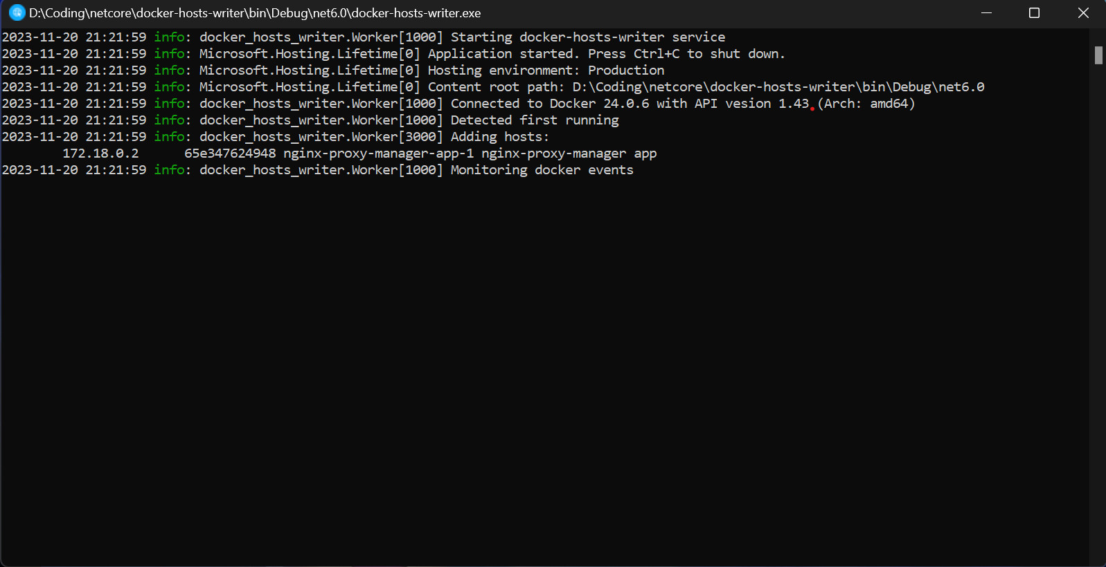 Docker Hosts Writer nenáročný nástroj sloužící pro přidání adresy kontejneru do souboru hostitelů (HOSTS) v systémech Windows a Linux. Pomocí příkazů a příslušných argumentů lze nastavit Docker Engine API endpoint, umístění HOSTS souboru, suffix i prefix pro každou doménu nebo aktivovat tichý výstup tj. potlačení zpráv.