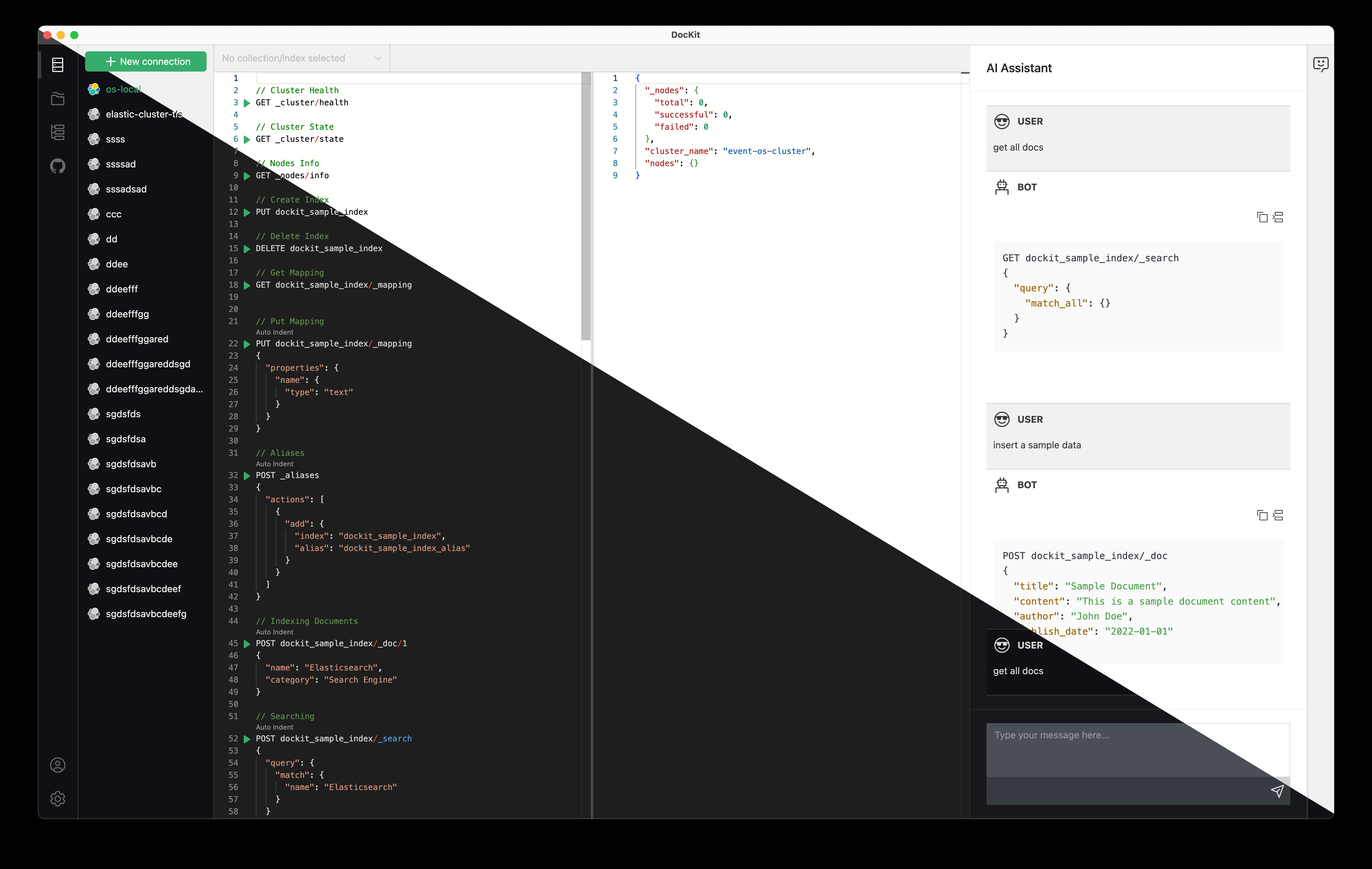 DocKit je desktopový klient pro databáze typu NoSQL, který podporuje vyhledávací analytické enginy Elasticsearch a OpenSearch. Klient také nabízí plnohodnotný editor (monaco-editor) pro vývojáře a umožňuje uchovávání připojení a ukládání souborů se zdrojovým kódem na disk.