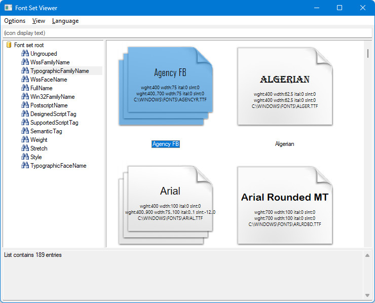 DWrite FontSetViewer je jednoduchá pomůcka určená pro prohlížení a analýzu fontů písma. V podstatě lze prohlížet všechny položky v IDWriteFontSet (sada fontů definovaná v DirectWrite API). Lze tedy prohlížet všechny ve Windows instalované i neinstalované fonty.
