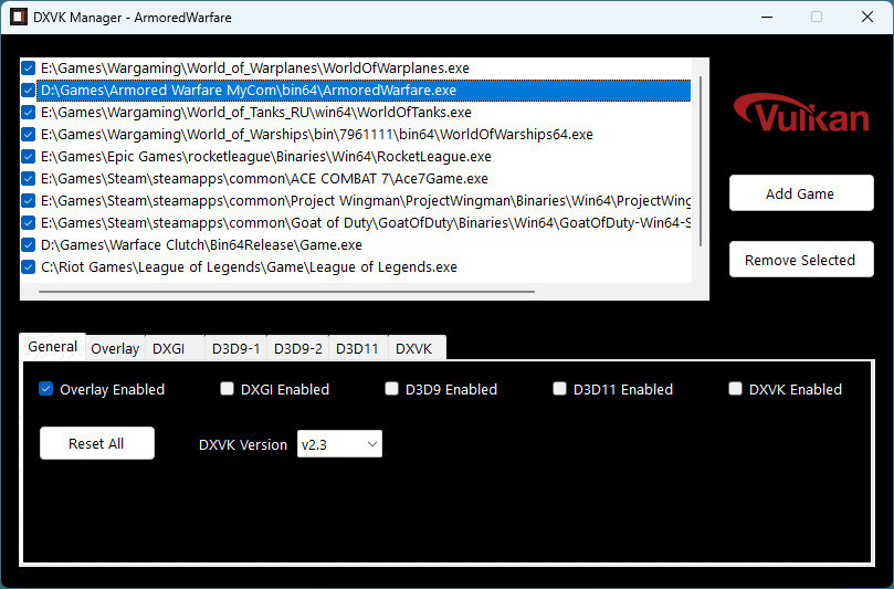 DXVK Manager je aplikace, jejíž pomocí může uživatel hrát PC hry určené pro DirectX 9, 10 a 11 s využitím Vulkan API