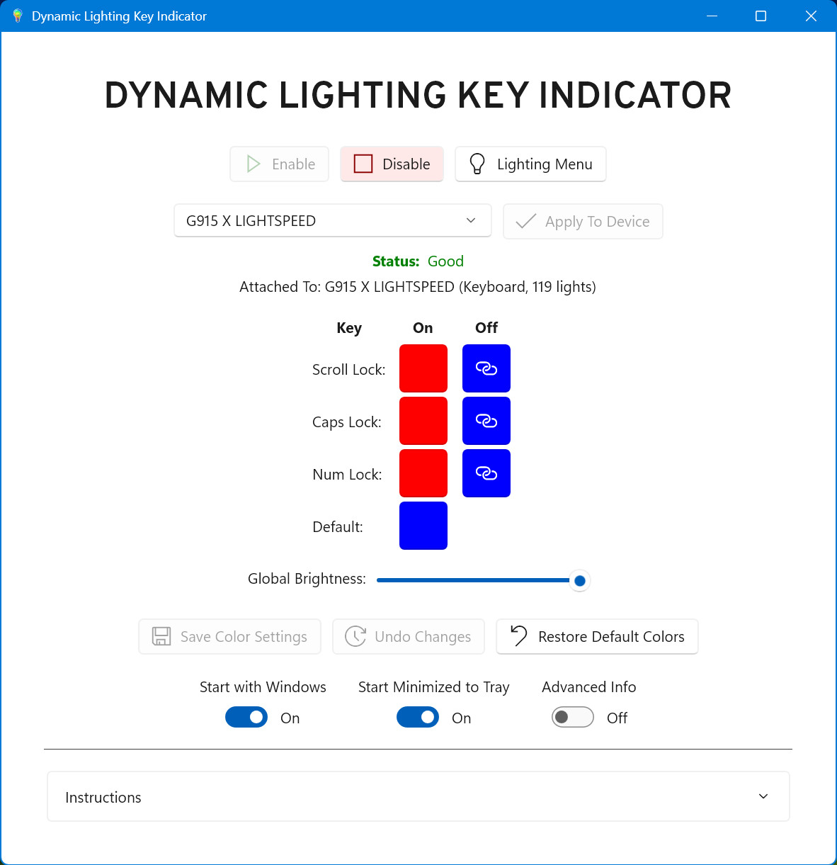 Dynamic Lighting Key Indicator je jednoduchá pomůcka, která využívá funkci Dynamic Lighting pro dynamickou změnu barev kláves Num Lock, Caps Lock a Scroll Lock na klávesnici podle jejich aktuálního stavu (zapnuto/vypnuto).