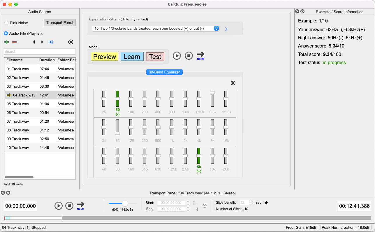 EarQuiz Frequencies umožňuje použití tzv. růžového šumu nebo jakéhokoli externího audio souboru jako zdroje zvuku. Program nabízí celkem 15 přednastavených úrovní s rostoucí obtížností a uživatelé mohou přizpůsobit úroveň zisku frekvence. Program také zabraňuje digitálnímu zkreslení během ekvalizace.