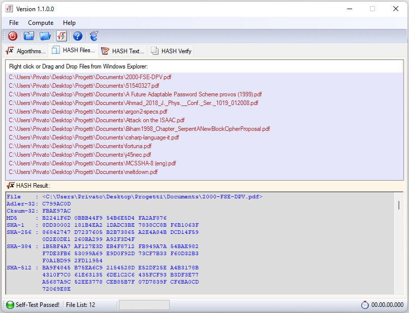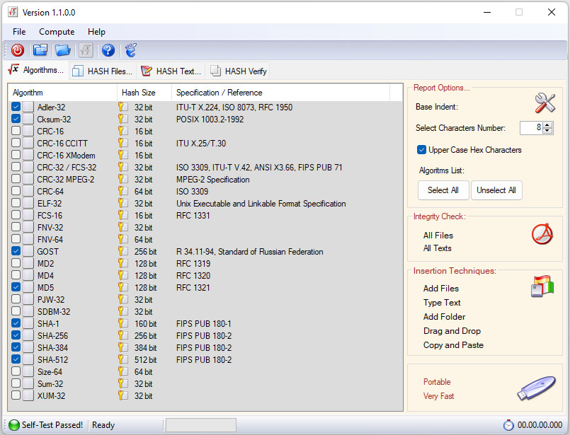 Podporovány hashovací jsou algoritmy Adler-32, Cksum-32, CRC-16, CRC-16-CCITT, CRC-16-XModem, CRC-32, CRC-32-MPEG2, CRC-64, ELF-32, FCS-16, FNV-32, FNV-64, GOST, MD2, MD4, MD5, PJW-32, SDBM-32, SHA-1, SHA-256, SHA-384, SHA-512, Sum-32, XUM-3 a další.