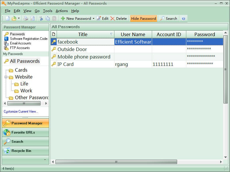 Efficient Password Manager Free Edition je aplikace pro přehlednou správu přihlašovacích jmen a hesel různé webové služby, FTP servery, e-mailové účty apod. Všechna hesla jsou samozřejmě ukládána v šifrované podobě a přístup k programu je chráněn hlavní heslem. Nechybí ani možnost generování vlastních bezpečných hesel.