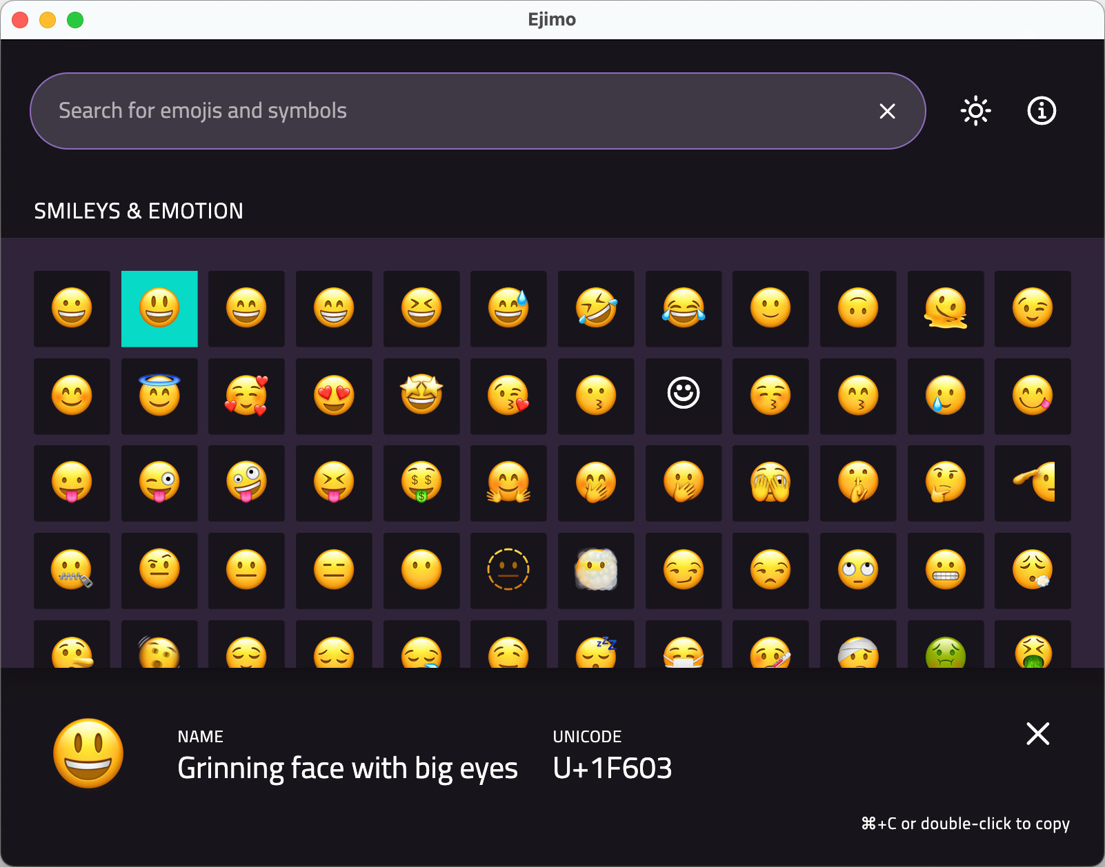 Ejimo je aplikace, která slouží jako obsáhlá knihovna Unicode znaků, emoji (emition ikon) a dalších symbolů. Program obsahuje více než 1800 emotion ikona 17000 různých symbolů. Možné je samozřejmě jejich vyhledávání dle klíčových slov a snadné kopírování do ostatních programů. Uživatel má k dispozici tmavé a světlé uživatelské rozhraní. Instalace není nutná.