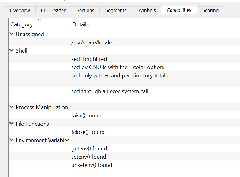 Podporováno je také parsování hlavičky, zobrazení sekcí a segmentů, zobrazení dat v hexadecimálním formátu nebo zjištění vlastností jako jsou např. shell, manipulace s procesy, funkce souboru nebo proměnné prostředí.
