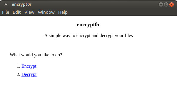 encrypt0r je pomůcka pro snadné šifrování a dešifrování souborů pomocí zadané přístupové fráze. Program má velice snadné ovládání a přehledné uživatelské rozhraní. Podporováno je ovládání pomocí drag and drop.