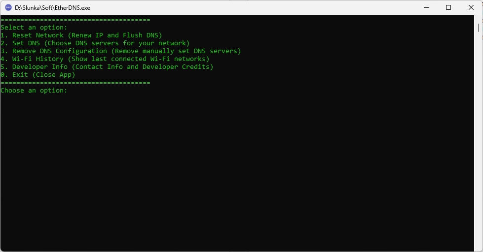 EtherDNS je snadno ovladatelná pomůcka sloužící pro resetování síťového nastavení počítače. Program také umožňuje odstranit DNS konfiguraci a prohlížet historii Wi-Fi sítíy, které byly v poslední době použity. Program má velmi snadné ovládání z prostředí příkazového řádku a najde využití například při rychlém odstraňování problémů a optimalizaci DNS nastavení pro webové i herní servery.