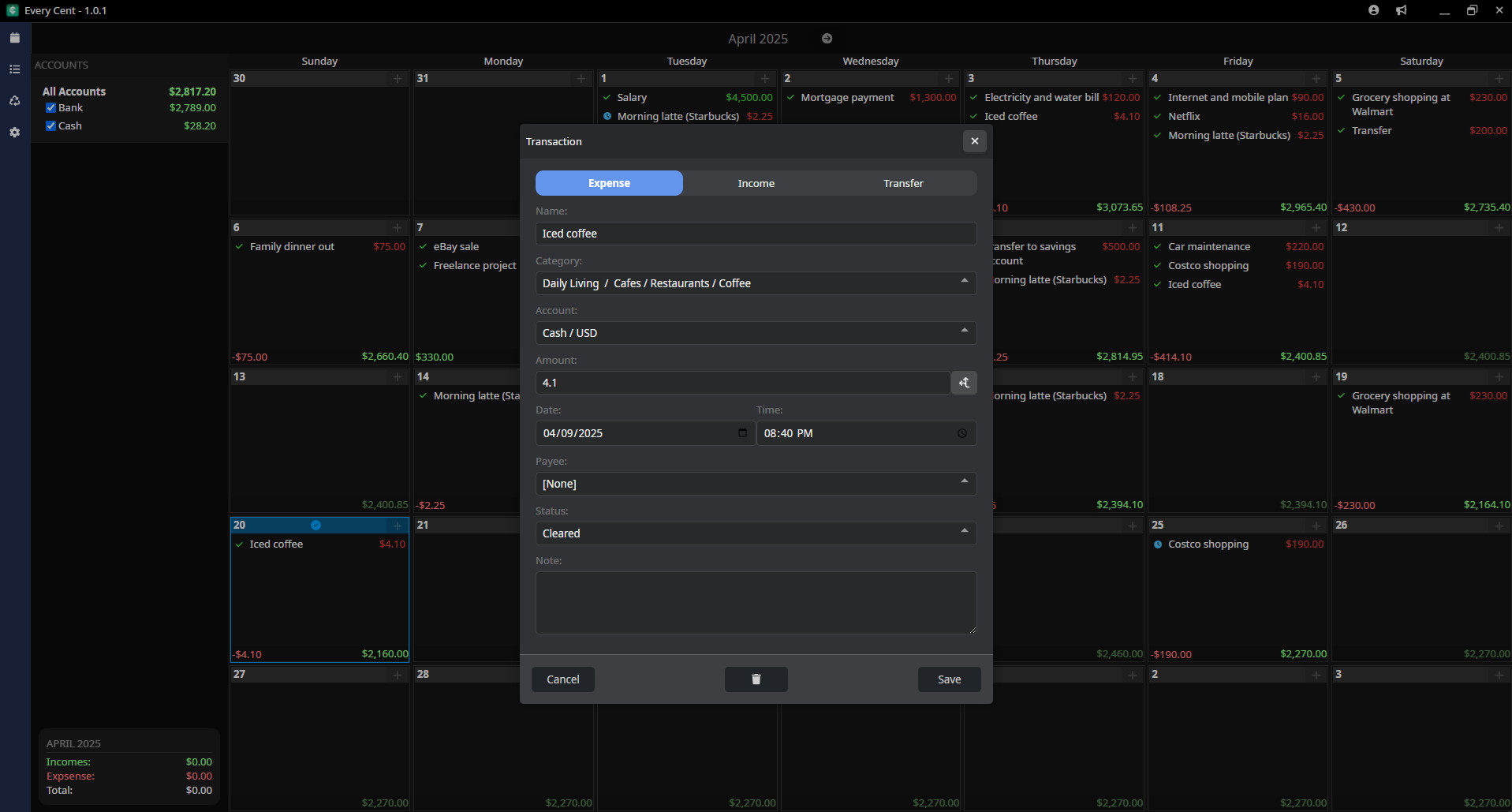 Every Cent v sobě spojuje vizuální přehlednost kalendáře s analytickou přesností seznamu finančních transakcí. Nabízí například nástroje pro vizuální plánování příjmů a výdajů, procházení, filtrování a třídění transakcí podle různých kritérií, nastavení pravidelných transakcí nebo práci s více měnami.