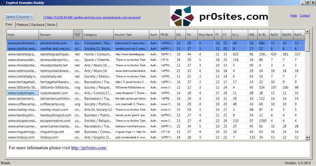 Expired Domains Buddy je nenáročný a užitečný nástroj pro zobrazení aktuálního seznamu expirovaných domén. U každé propadlé domény se zobrazují i další podrobné informace (kategorie, popis, přípona, PageRank, Ping, počet zpětných odkazů...).