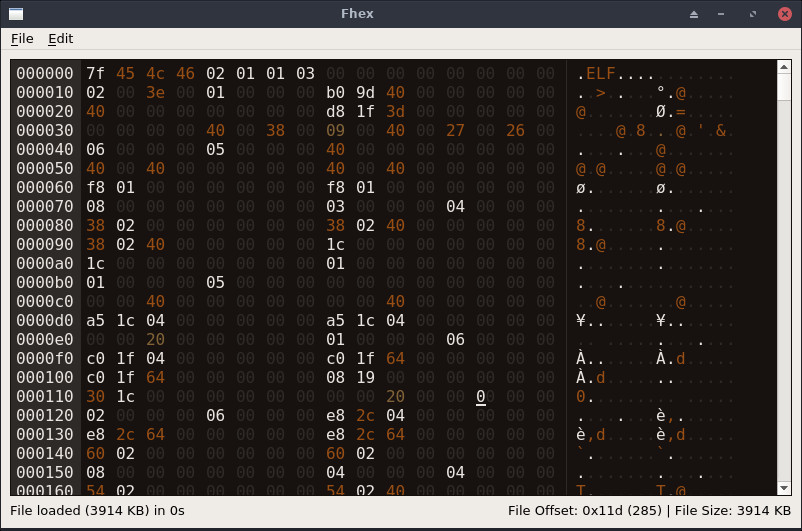 Fhex je pokročilý editor souborů přímo v jejich hexadecimální podobě. Editor dokáže načítat pouze části velkých souborů a tím lze ušetřit operační paměť.