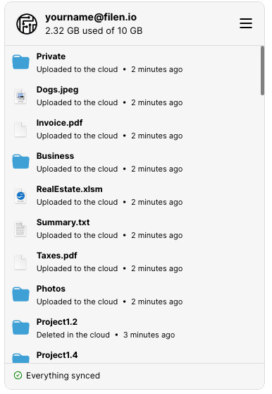 Filen je desktopový klient určený pro zálohování, synchronizaci a nebo jen přenos dat mezi zařízeními připojenými k jednomu účtu. Program nabízí až 5 různých režimů synchronizace pro různé potřeby uživatelů. Poradí si také se správou využití šířky pásma pro omezení datového toku při přenosu souborů.