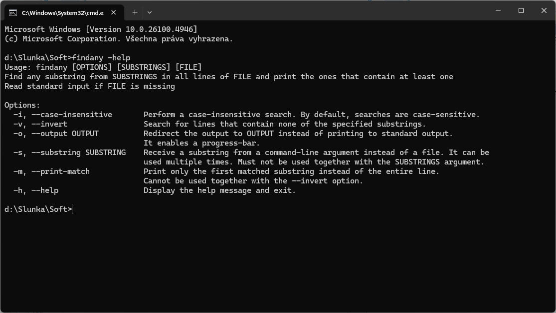 findany je nástroj ovládaný pomocí příkazového řádku, který slouží pro rychlé vyhledávání podřetězců ve víceřádkovém textovém souboru. Nástroj je určený především pro efektivní práci s miliony hledaných frází. Pomocí různých argumentů je pak možné nastavit ignorování velikosti písmen, invertování výběru nebo specifikovat vlastní výstupní soubor.