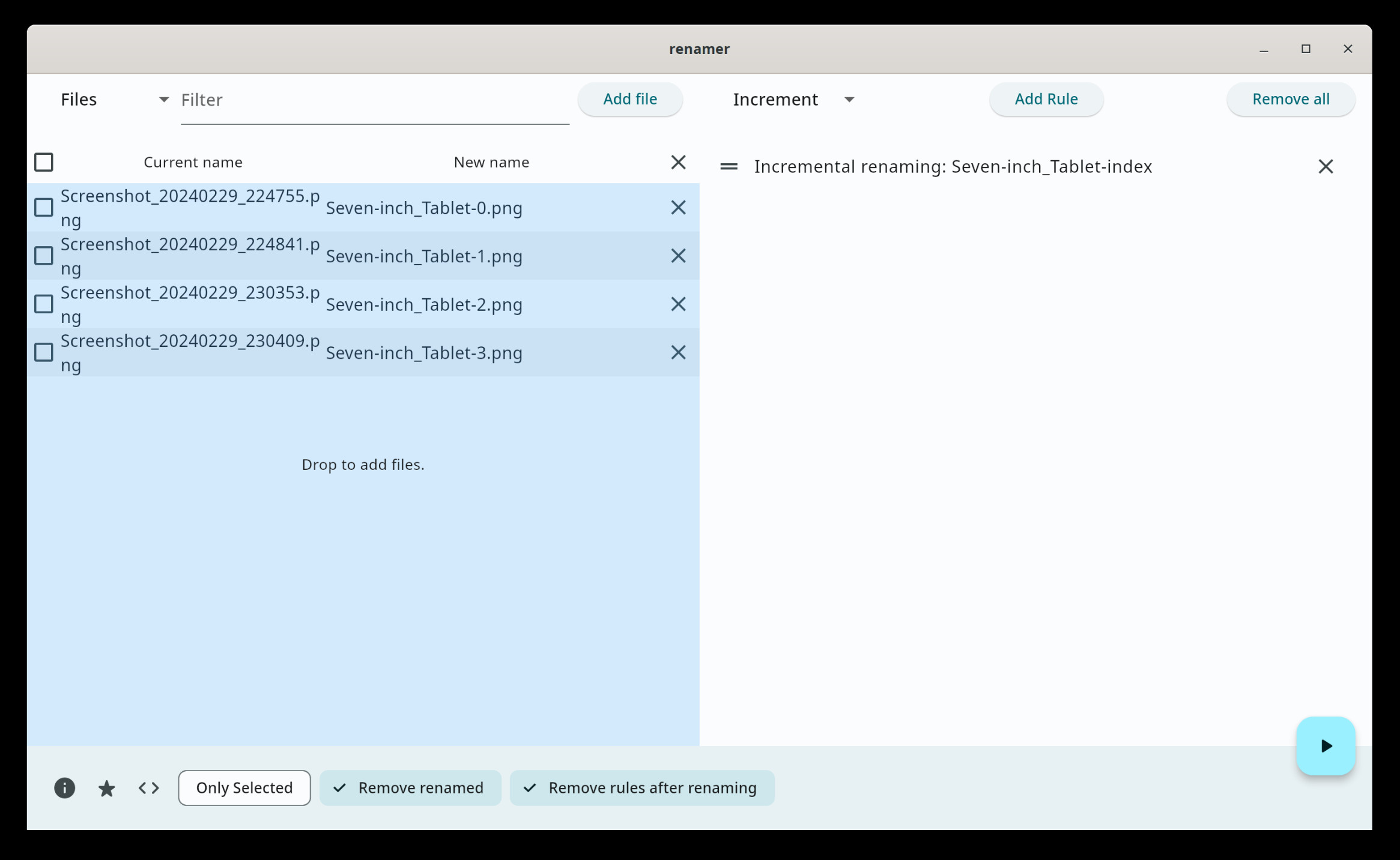 Flut Renamer je pomocník sloužící k hromadnému přejmenování souborů na základě kritérií definovaných uživatelem. Názvy souborů lze měnit vkládáním, nahrazováním, mazáním nebo přeuspořádáním textu nebo znaků. Provádět lze také extrakci různých metadat (např. EXIF) a na jejich základě měnit názvy souborů.