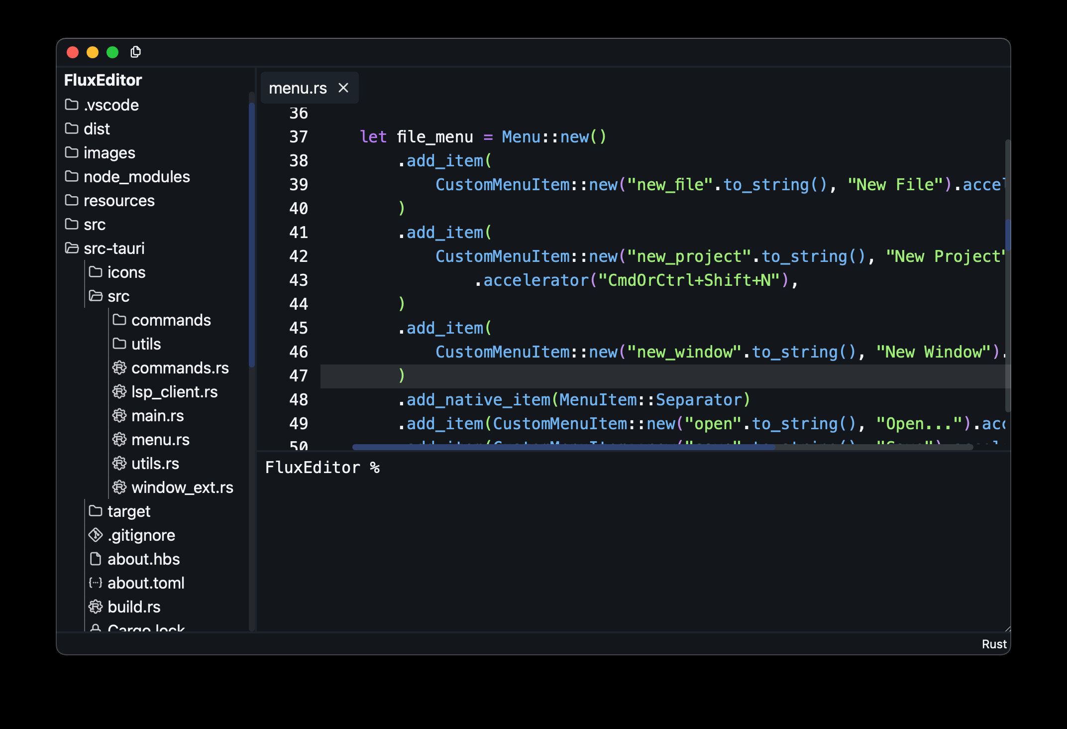 Flux Editor je minimalistický a systémově nenáročný editor zdrojového kódu s podporou zvýraznění syntaxe. Nechybí ani vestavěný průzkumník souborů, terminál a podpora Gitu. Pomocí panelu v levé části okna je možné procházet celou adresářovou strukturu projektu.