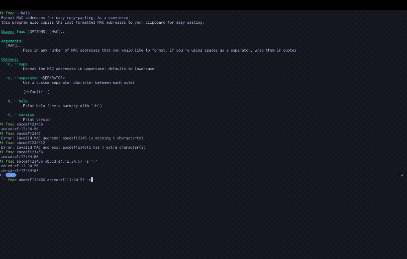 FMAC je nenáročný a rychlý nástroj v oblasti příkazového řádku, který s určený pro formátování MAC adres. Nástroj umožňuje například nastavení velikosti znaků, použití vlastního oddělovače mezi každým oktetem (výchozí je dvojtečka) a kopírování výsledné MAC adresy přímo do schránky.
