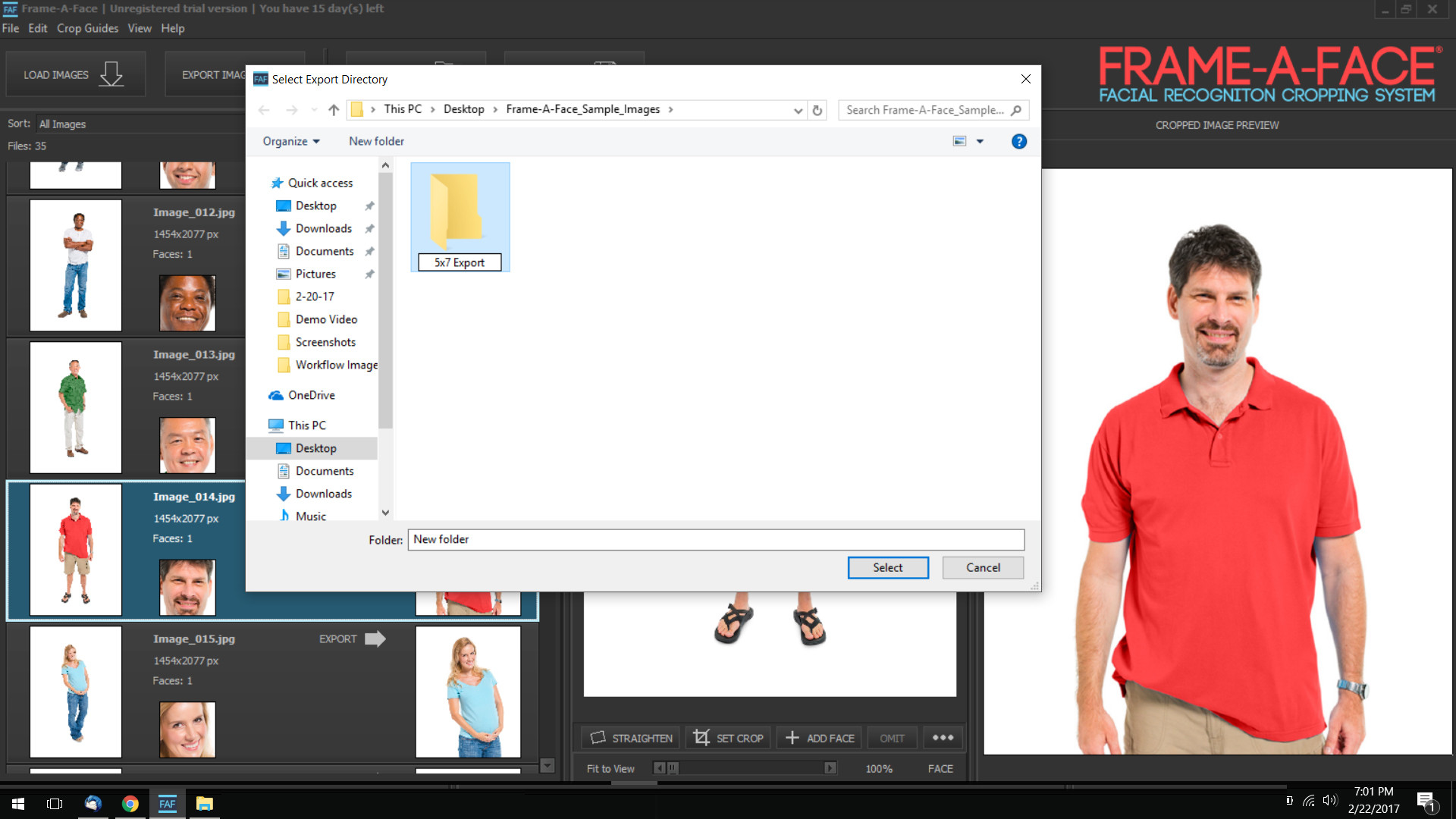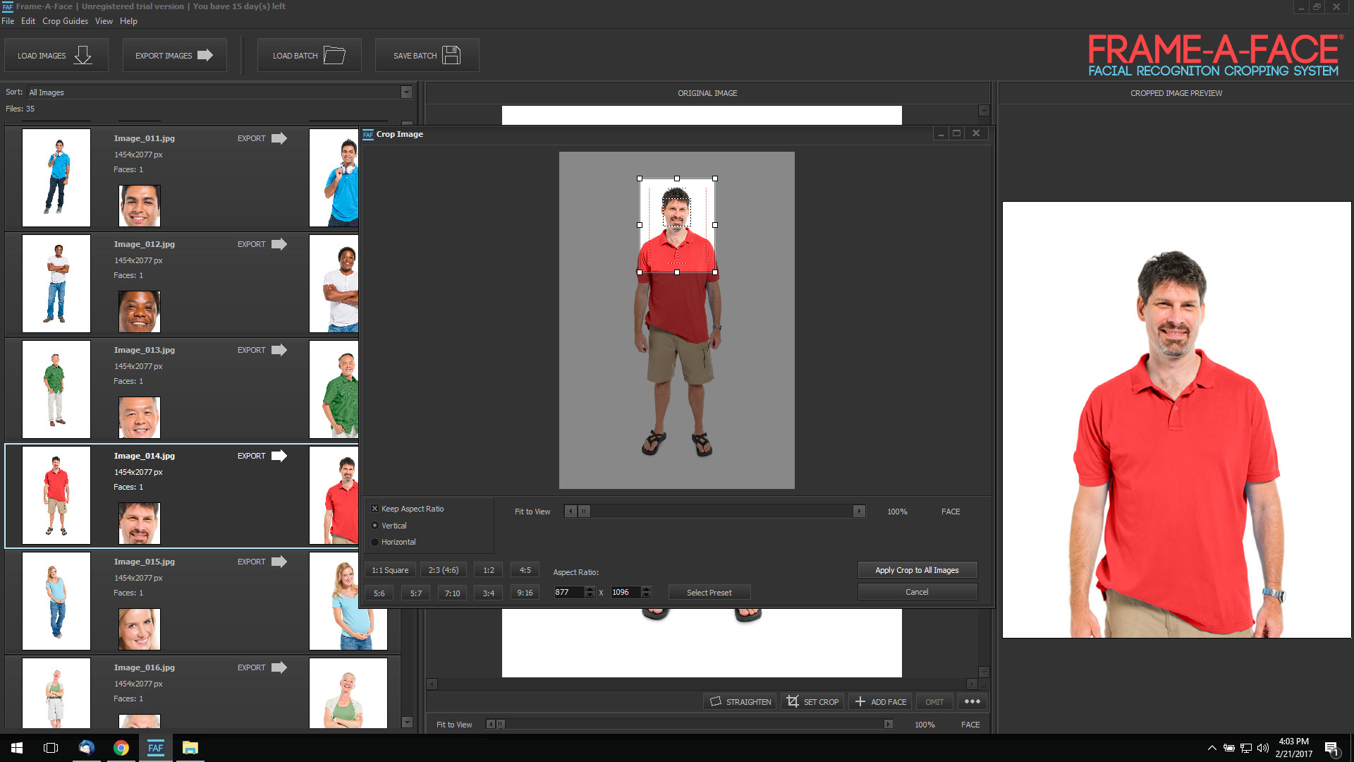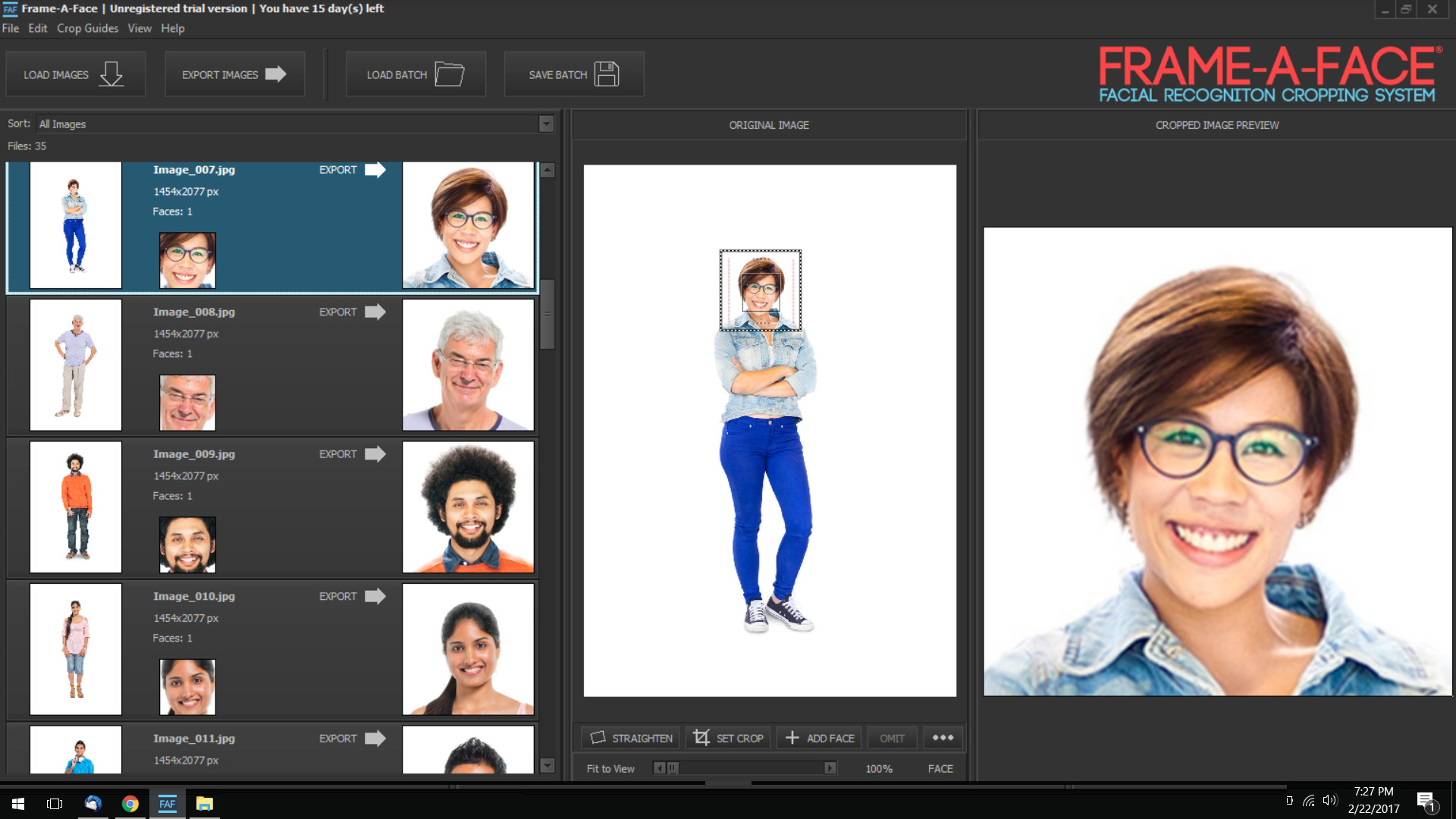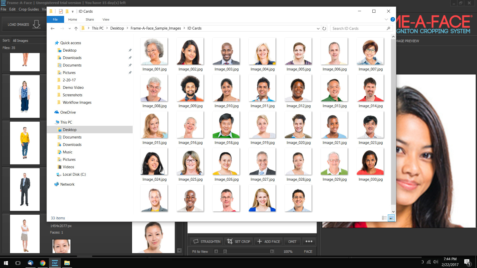 Frame-A-Face je aplikace, která pomocí ořezání digitálních fotografií dokáže vytvořit pěkné portrétové či průkazové fotografie. Program pro tuto činnost využívá pokročilou technologii rozpoznávání obličeje. Poradí si také se skenováním velkého množství obrázků a fotografie lze automaticky ořezávat na předem definovaný rozměr.
