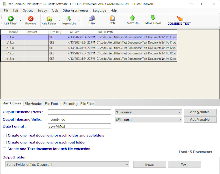 Free Combine Text Files 4dots je přehledný nástroj sloužící pro spojování několika textových souborů do jednoho. Program si poradí se soubory typu TXT, INI a dalšími, která obsahují prostá text. Vybrané soubory lze spojit do jednoho nebo spojit soubory například v rámci jedné složky a podsložek. Uživatel může navíc přesně definovat pojmenování výstupního textového souboru.