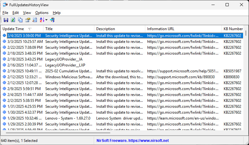 FullUpdatesHistoryView je jednoduchý pomocník, který zobrazuje kompletní historii aktualizací systému. Nástroj zobrazuje seznam všech aktualizací Windows, včetně těch z Windows Update a Microsoft Store. U každé aktualizace pak uvádí řadu podrobností, jako jsou například: aktualizace, KB číslo, datum instalace, stav aktualizace, typ aktualizace (bezpečnostní záplata, kumulativní update,...) a zdroj instalace.