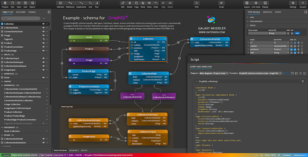 Galaxy Modeler je profesionální aplikace pro návrh schémat pro modelování dat v GraphQL. Program umožňuje snadno vytvářet diagramy, importovat existující GraphQL schémata a generovat výsledné skripty i kompletní dokumentaci.