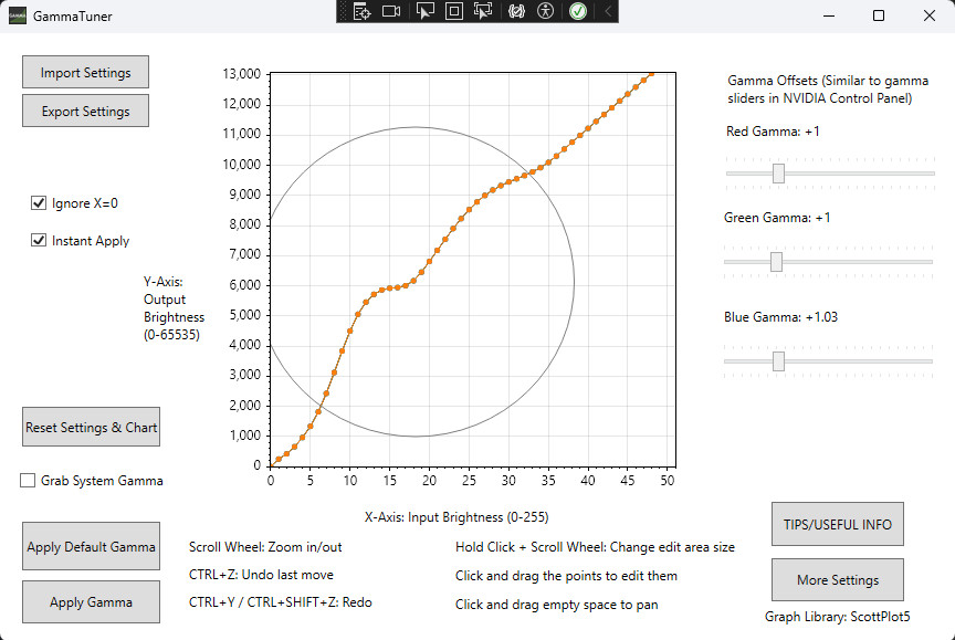 Uživatel může pomocí grafu ručně nastavit jas v jednotlivých bodech gamma tabulky. Vlastní vytvořené profily lze ukládat a snadno znovu použít. Vytvořit lze i zvláštní gamma profil pro SDR a HDR režimy a ty pak automaticky přepínat.