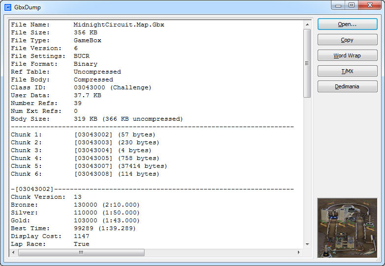GbxDump je nástroj sloužící pro zobrazení obsahu záhlaví souborů používaných herním enginem Nadeo (GameBox). Tyto soubory obsahují například mapy, výzvy, záznamy, balíčky, bloky, objekty nebo položky. Po instalaci programu je přidána položka do kontextového menu souboru GameBox (Gbx), pomocí které lze zobrazit obsah hlavičky pro daný soubor.