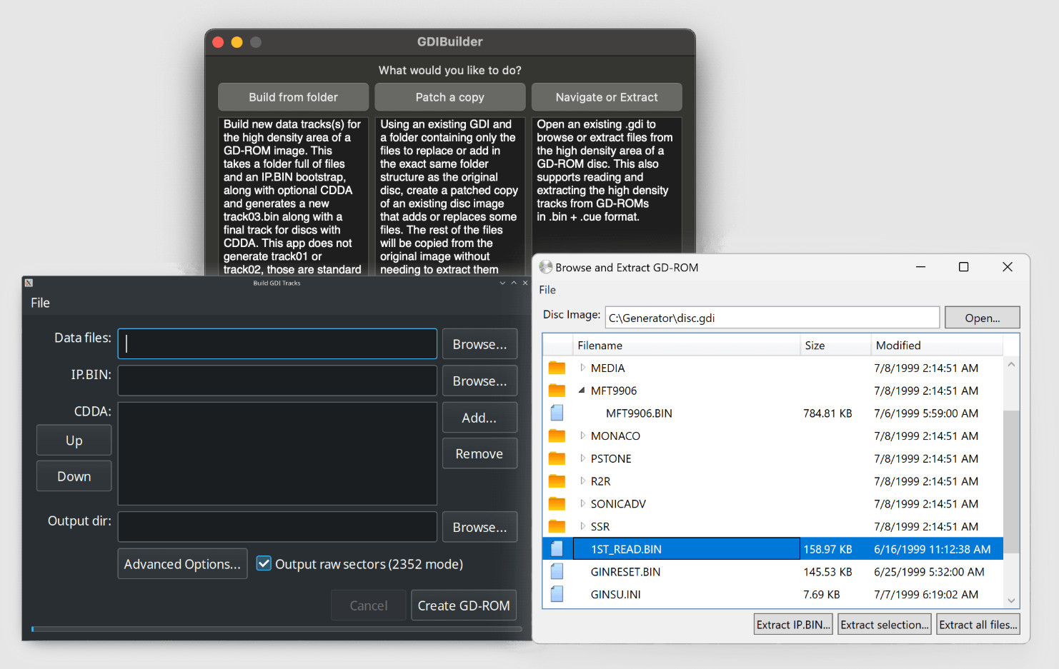 GDIbuilder umožňuje také vytvořit data tracky pro "high-density" oblast GD-ROM disku, generovat track TOC a zapsat jej do boot sektoru. V režimu úprav je pak možné vytvořit modifikovanou kopii existujícího disku nahrazením nebo přidáním souborů.