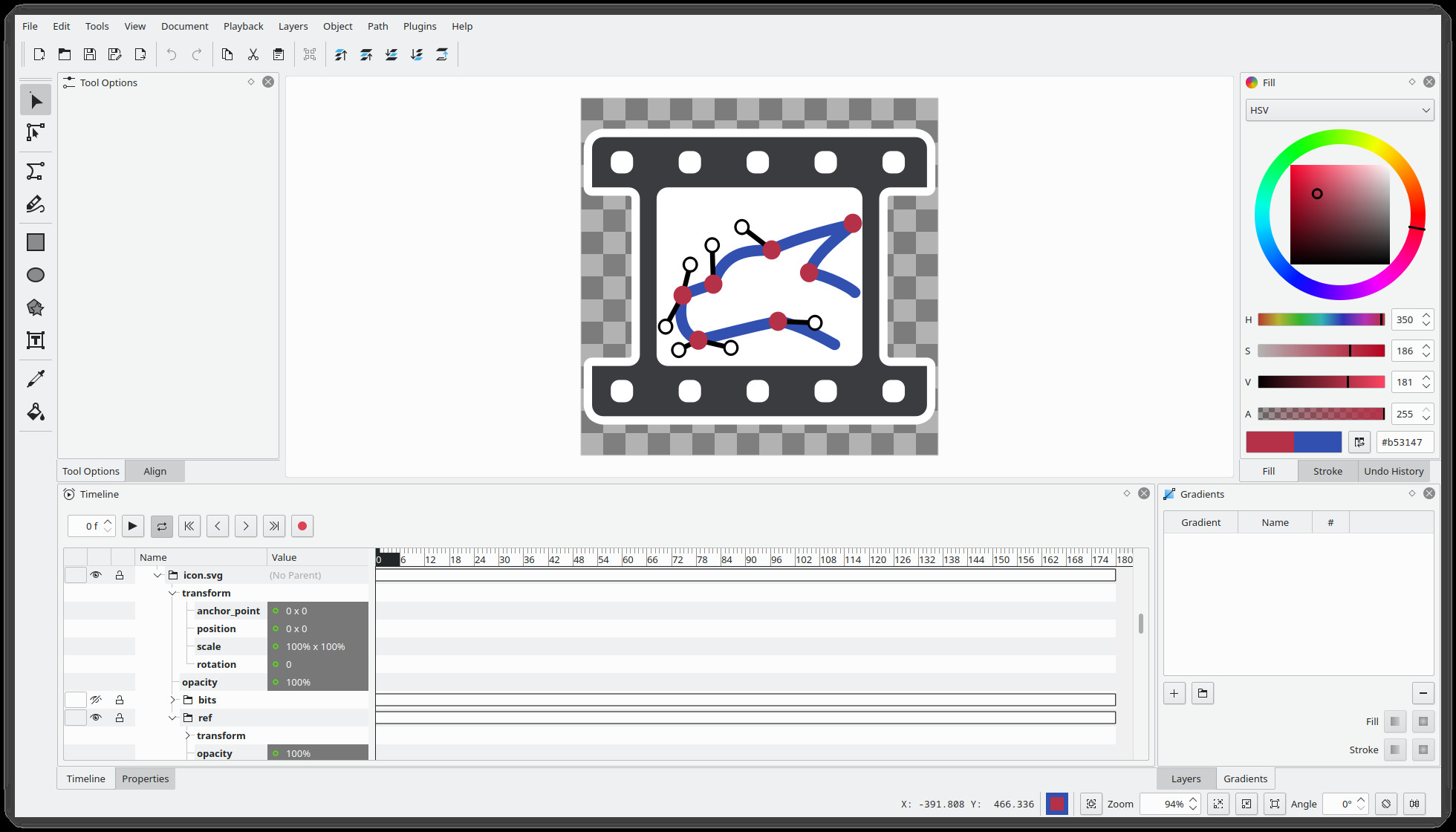 Glaxnimate je aplikace sloužící pro vytváření animaci pomocí vektorových grafických prvků. Program nabízí funkce a nástroje pro kreslení základních tvarů (čáry, křivky, body, geometrické tvary,...), podporována je práce s barvami včetně barevných modelů a mnoho dalšího. Podporována je rovněž editace vektorové grafiky a práce s vrstvami. Při tvorbě animací je možné využít časovou osu.