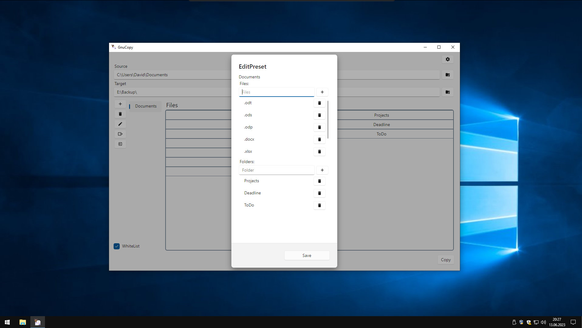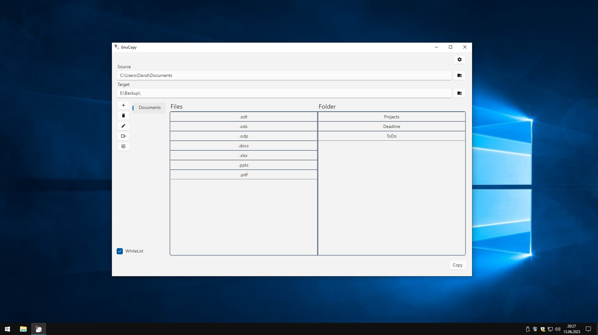 GnuCopy je nástroj pro pokročilé kopírování souborů mezi složkami respektive adresáři. Při kopírování je možné využít detailní filtrování souborů dle jejich typů. Program umožňuje vytvořit předvolby se soubory a složkami, které uživatel nechce zahrnout do procesu kopírování dat.
