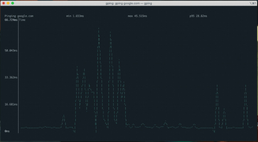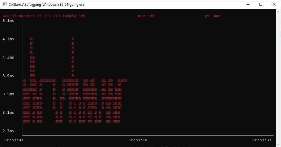 gping je malý a nenáročný nástroj pro spuštění a číselné i grafické vyhodnocení výsledků síťového příkazu PING. Program se neinstaluje a ovládá se pomocí příkazového řádku. Zadat lze URL adresu nebo rovnou IP adresu testovaného serveru..