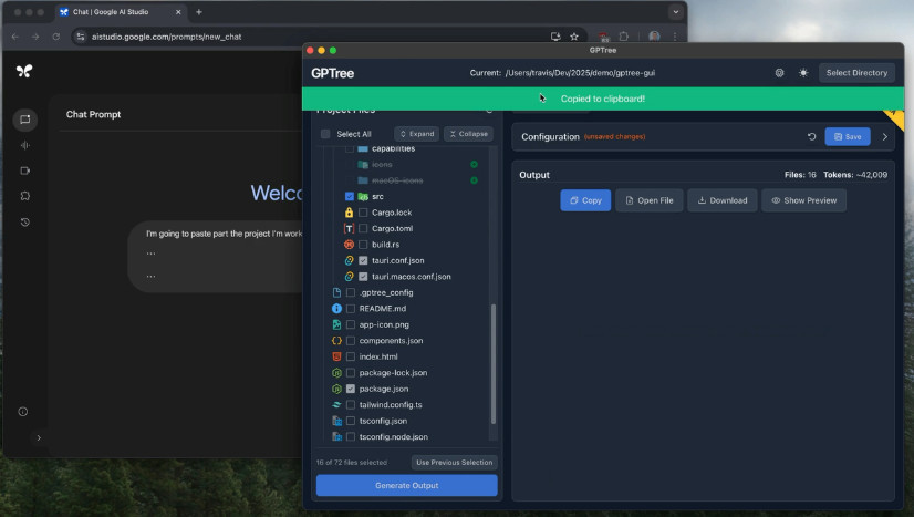 Uživatel může vygenerovat textový výstup, který obsahuje strukturu složek a obsahy vybraných souborů, což usnadňuje poskytování kontextu pro analýzu nebo generování zdrojového kódu. Výstup lze uložit jako jeden textový soubor nebo obsah zkopírovat do schránky.