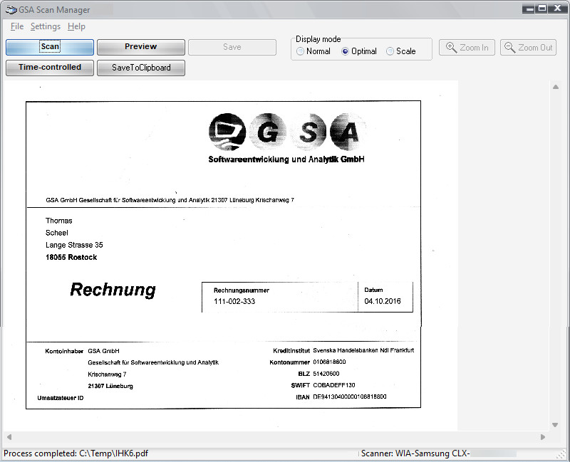 GSA Scan Manager je aplikace určená pro skenování dokumentů, obrázků nebo diapozitivů pomocí rozhraní TWAIN do souborů ve formátech BMP, JPG, PNG a PDF. Před samotným skenováním lze nastavit například úroveň komprese a vybrat metodu skenování a využít lze i časovač pro automatické skenování v nastavený čas. Program má snadné a intuitivní ovládání.