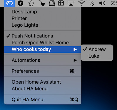 HA Menu for Mac je nástroj pro pohodlné spuštění funkcí domácího asistenta (Home Assistent) přímo z oblasti menu baru v macOS. Program umožňuje například rozsvícení/zhasnutí světel, provádění automatizovaných úkonů a další funkce. Poradí si také s aktivací scén a skriptů.