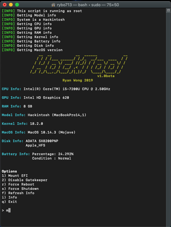Hakku for Mac zobrazuje například název a popis procesoru (CPU), grafické karty (GPU), operační paměti, jádra, verze macOS, disku a baterie. Podporuje rovněž přístup k mountování EFI, zakázání Gatekeeperu nebo vynucení restartu či vypnutí počítače.