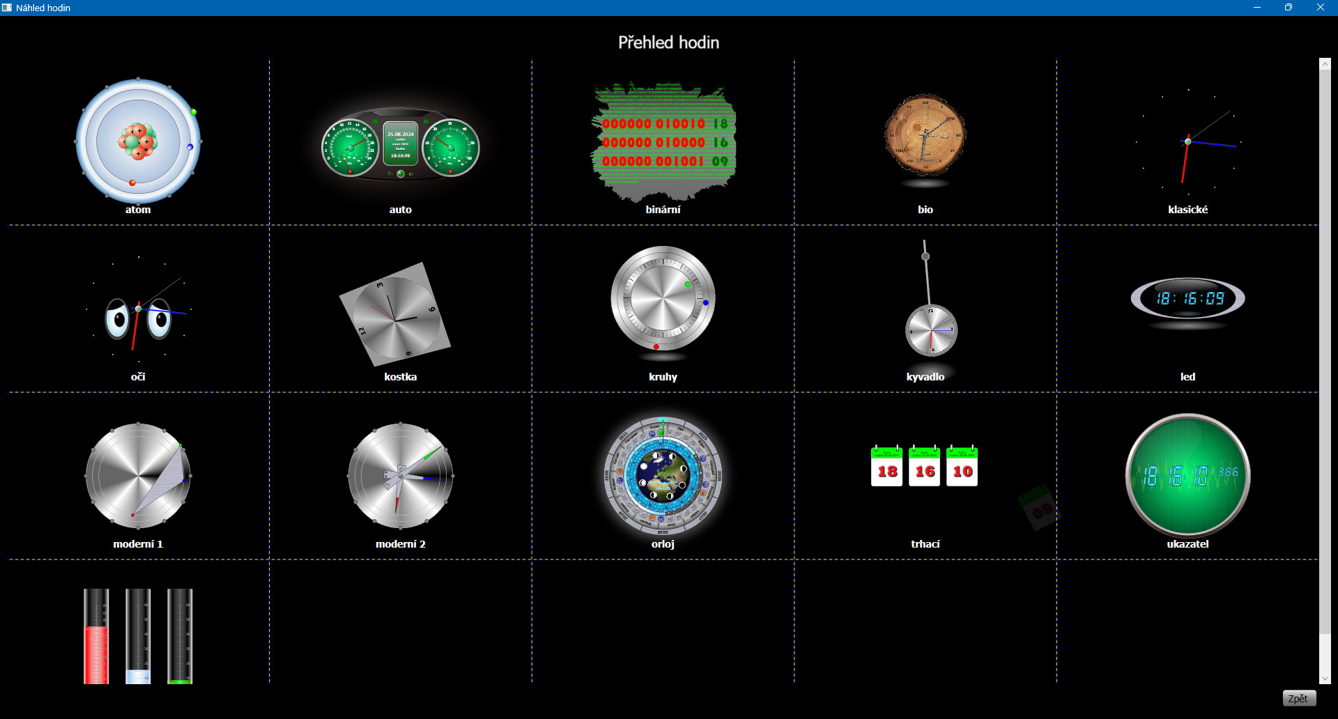 Program slouží jako šetřič obrazovky a obsahuje 16 různých hodin.