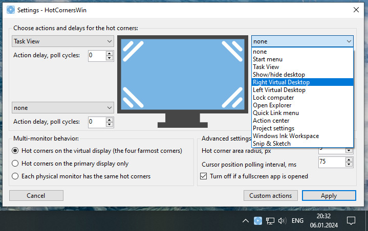 HotCornersWin je nástroj pro vytvoření tzv. "hot corners" tj. aktivních rohů, ve Windows. Ke každému rohu pracovní plochy lze pak přiřadit vybranou funkci, která se aktivuje najetím kurzoru myši přes příslušný roh. Tato funkce je známá především ze systému macOS.