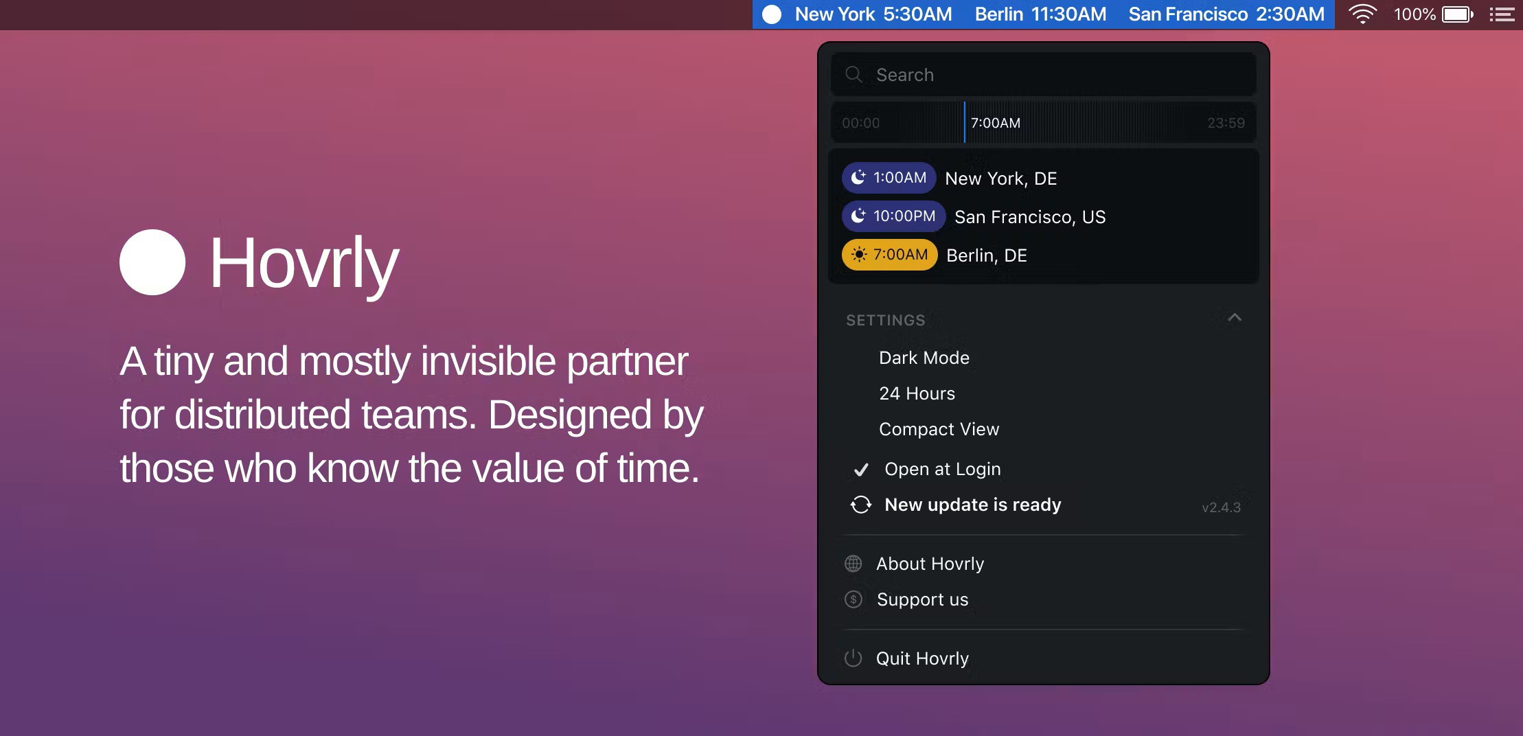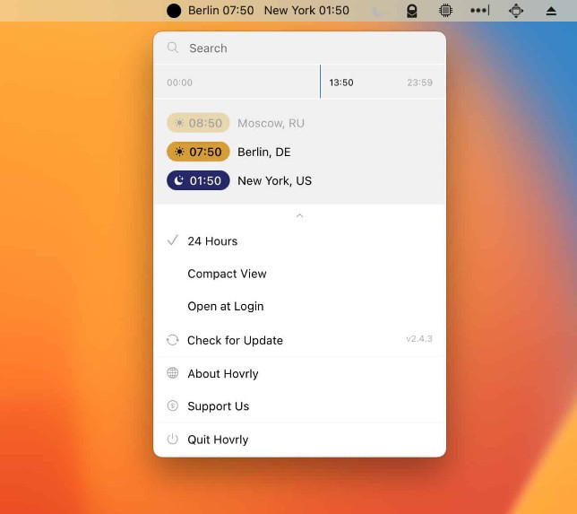 Hovrly for Mac je nenáročný pomocník, který v oblasti menu baru zobrazuje aktuální čas ve vybraných časových pásmech. Umožňuje vyhledat a přidat libovolný počet časových pásem. Jednotlivá pásma jsou pak v menu baru zobrazena vedle sebe, ale je možné použít i režim složeného zobrazení pro úsporu místa, kdy lze mezi jednotlivými časovými pásmy přepínat.